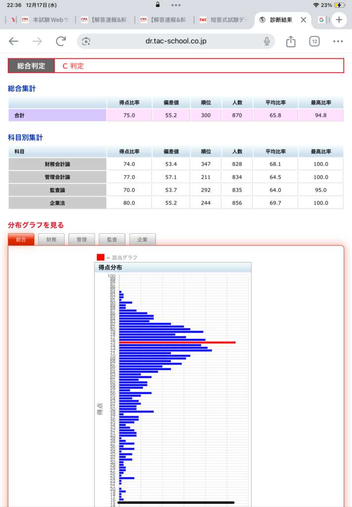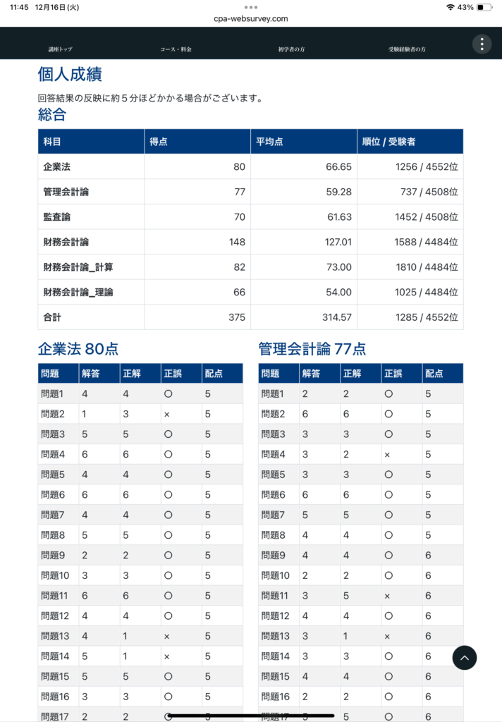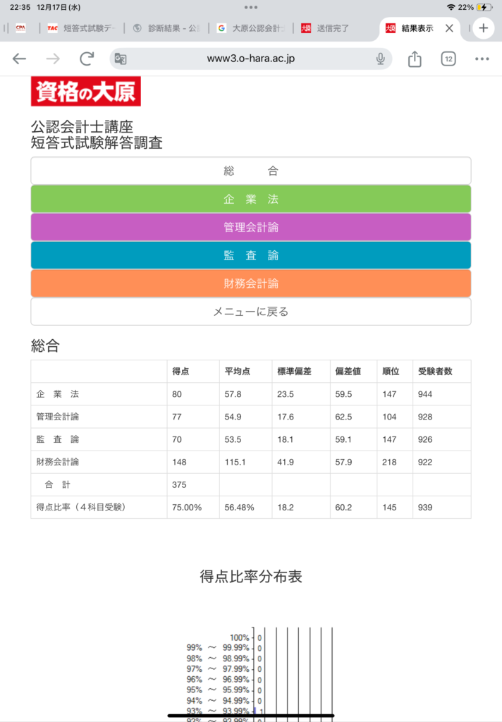 自己採点の結果は、企業法80、管理会計論77、監査論70、財務会計論148の合計375(75%)でした。